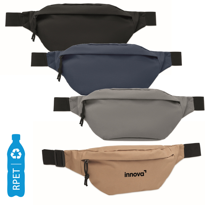 Heuptasje van 600D RPET polyester met hoofdvak met rits en verborgen achtervak met rits.