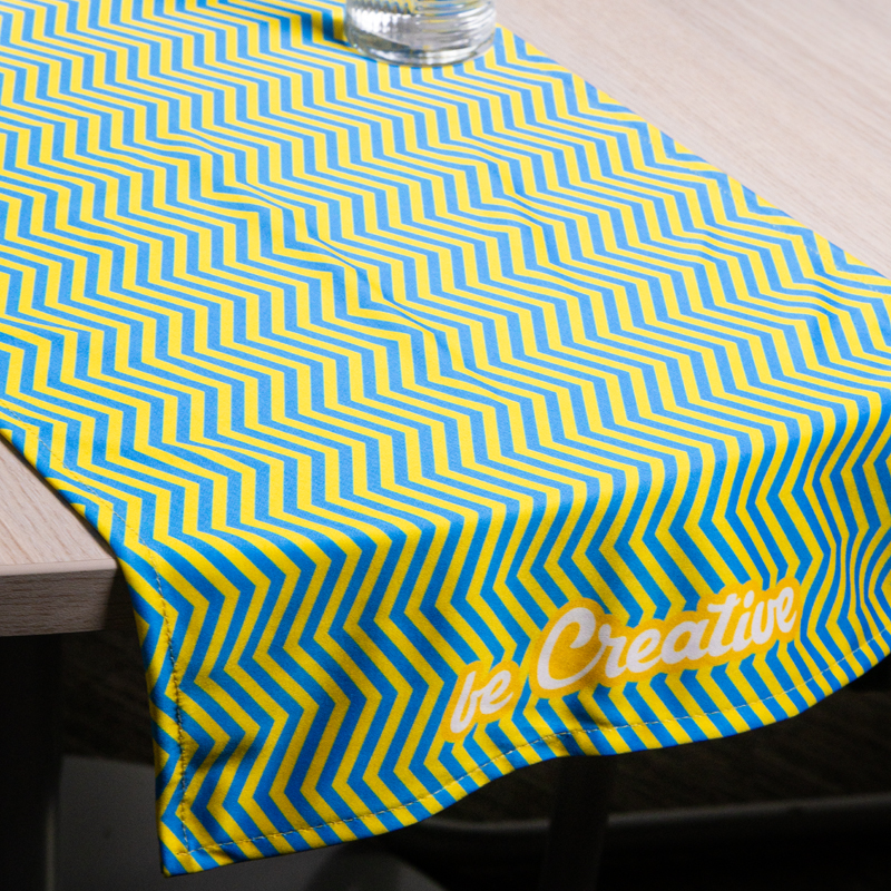Custom made RPET microvezel (170 g/m2) tafelloper met all-over sublimatie bedrukking.