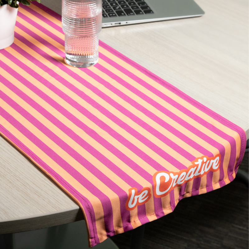 Custom made RPET microvezel (170 g/m2) tafelloper met all-over sublimatie bedrukking.