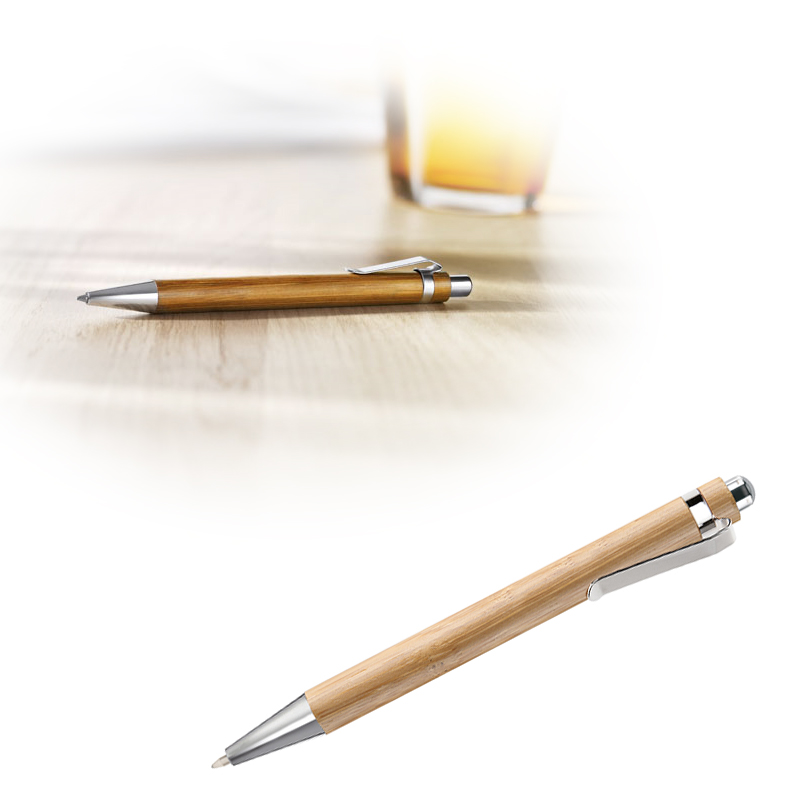 Bamboe balpen met glimmende zilverkleurige delen.