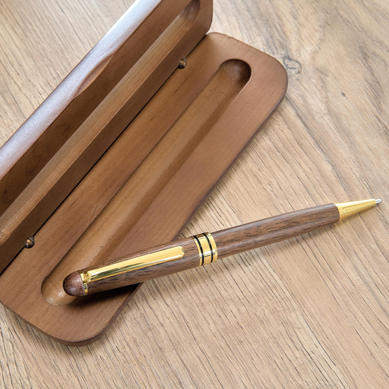 Walnoothouten en messing balpen met draaimechanisme, metalen punt, clip en afwerking.