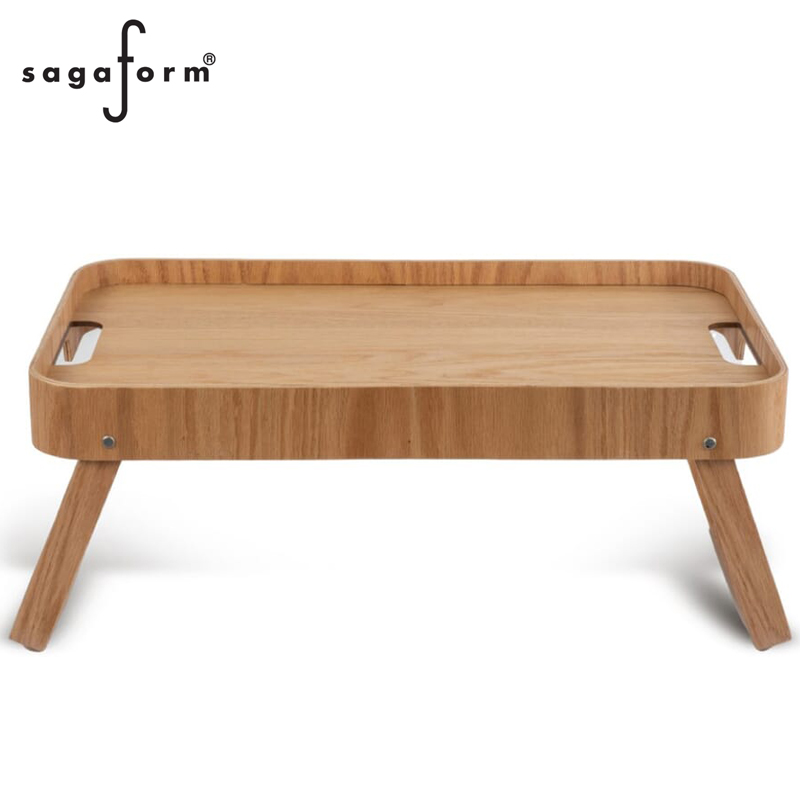 Het dienblad is gemaakt van rood eikenhout uit gecertificeerde bosbouw en heeft inklapbare poten.
