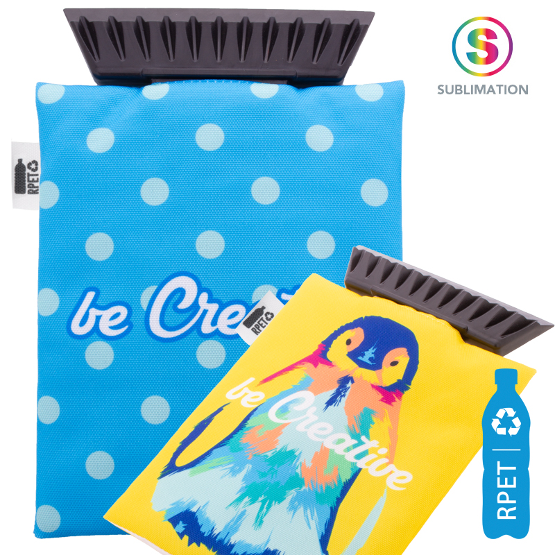 Custom made kunststof ijskrabber met 600D RPET polyester handschoen.