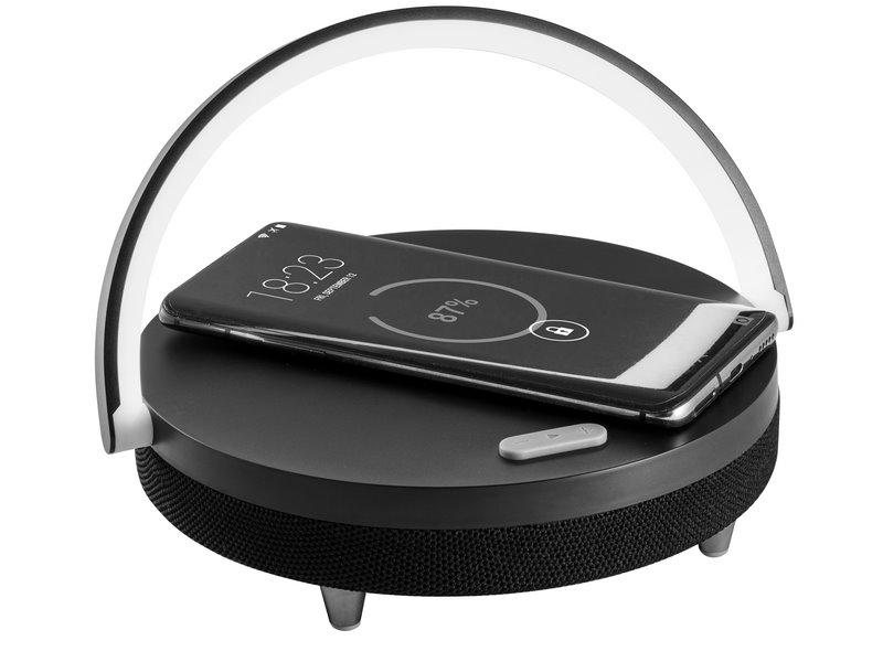 Met een oneerbiedig en gedurfd ontwerp kan deze luidspreker ook dienen als houder voor een mobiele telefoon, een lamp met 3 intensiteitsniveaus en een 10W draadloze oplader met een capaciteit van 1200mAh, 5V/2,1A en 9V/1.67A ingangen en 5V/1A en 9V/1.2A