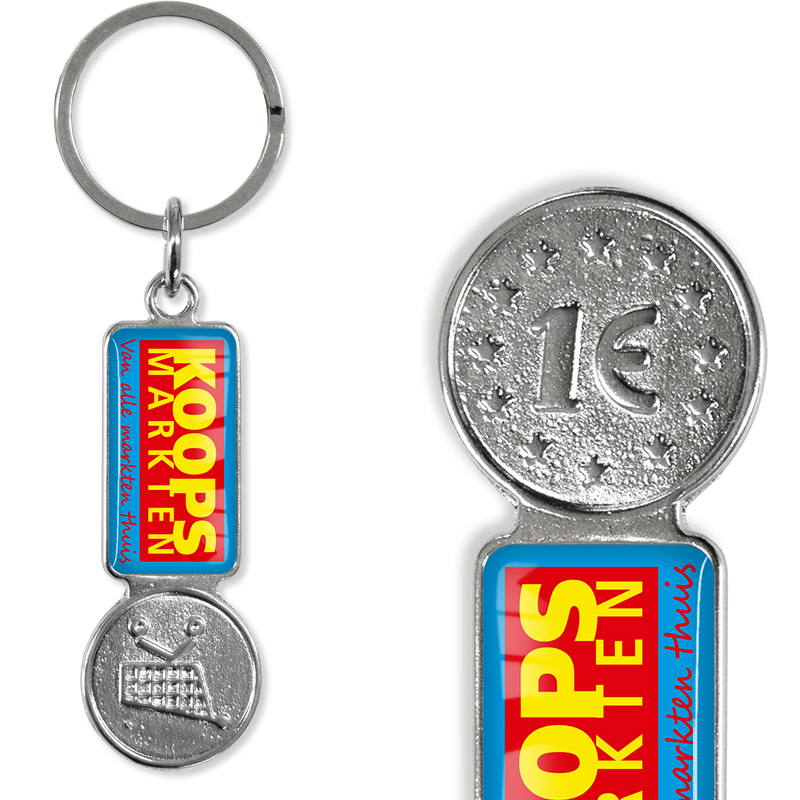 Met 2- zijdige full colour doming 30 x 15 mm. winkelwagenmunthouder kan ook bedrukt worden.