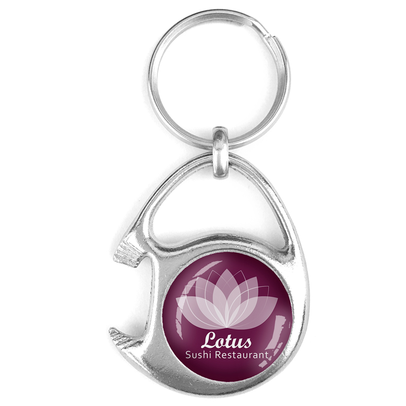 Met full colour doming ø 23.5 mm. eenzijdig. zowel flesopener, als blikopener, als winkelwagenmunthouder. zowel €0.50 als €1 munt. winkelwagenmunthouder kan ook bedrukt worden.