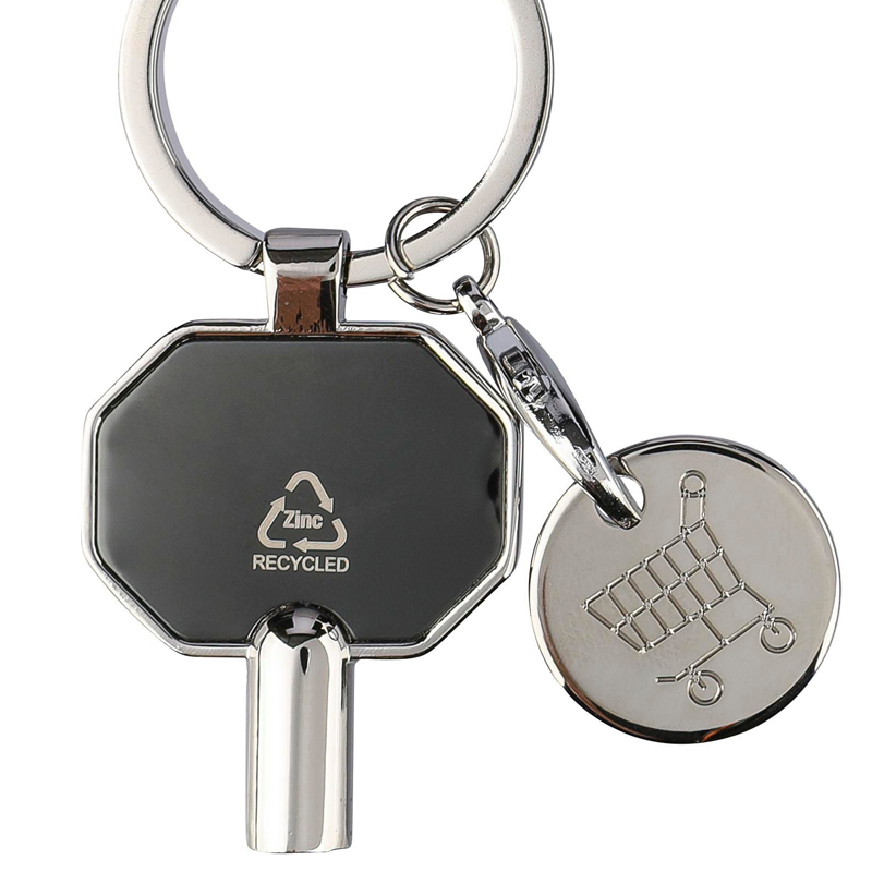 Sleutelhanger van gerecycled zinklegering met radiatorsleutel en winkelmunt.