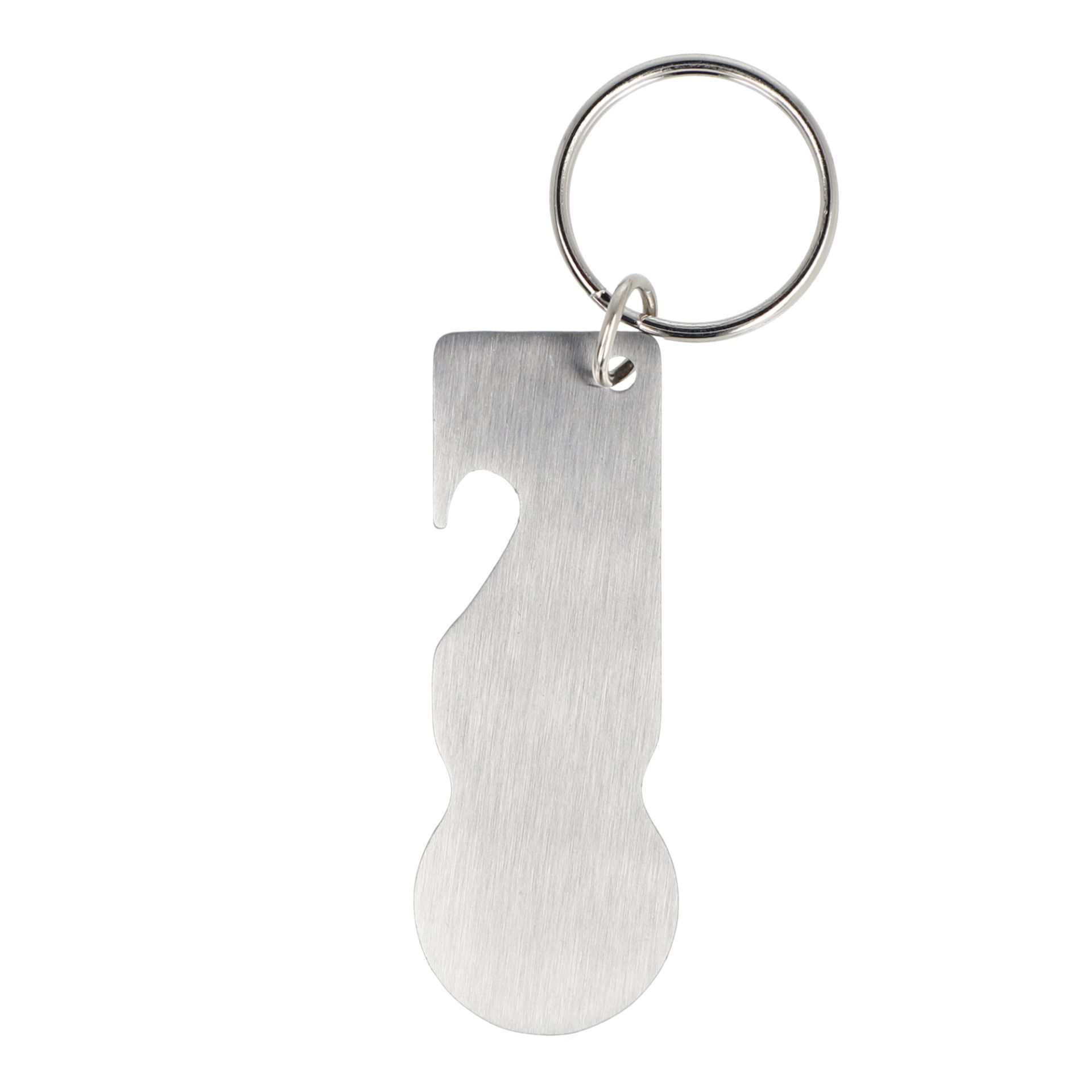 Roestvrijstalen sleutelhanger met geïntegreerde flesopener en winkelwagenmunt, geschikt voor de meeste winkelwagens in West-Europa.