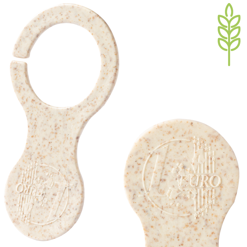 Ecologisch tarwestro en ABS-kunststof winkelwagenmunt, met euroteken aan één zijde.