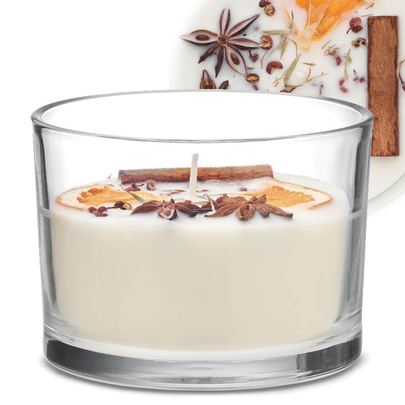 Geparfumeerde plantaardige kaars met gedroogde bloemen en vruchten (kaneel en citrus) in glazen pothouder.