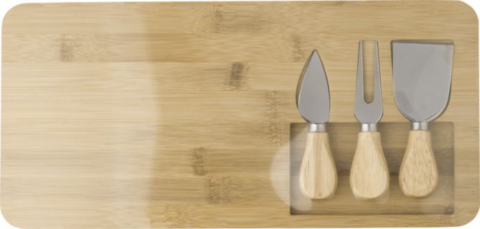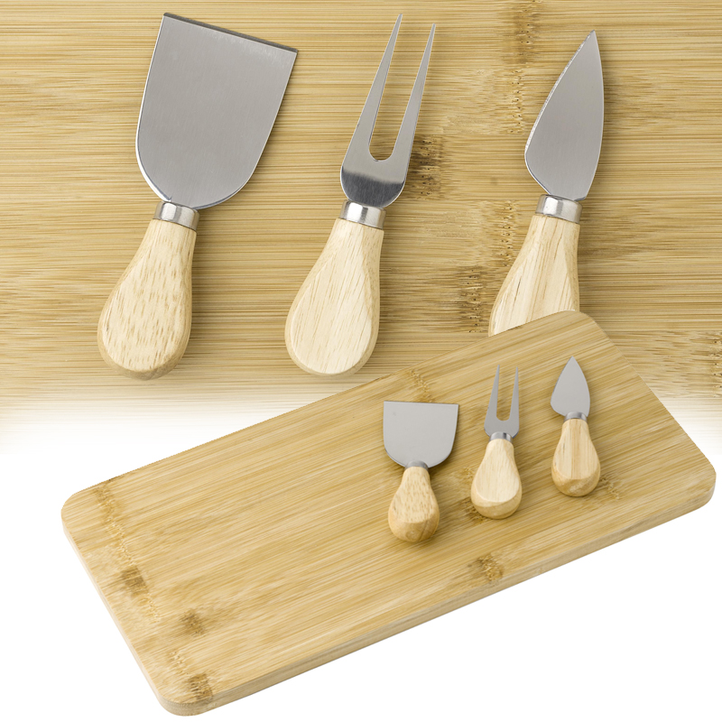 Bamboe kaasplank met drie messen die elk in uitsparingen in de plank passen.
