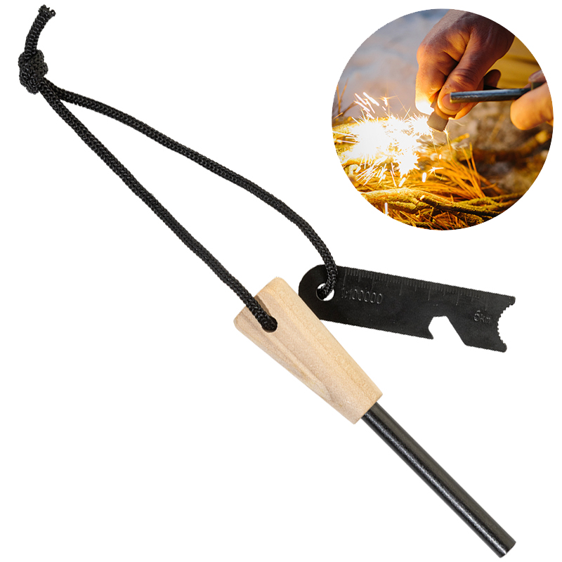 Survival fire starter tool met houten handvat en multifunctionele roestvrijstalen schraper uitgerust met een liniaal, flesopener en zeskantsleutel.