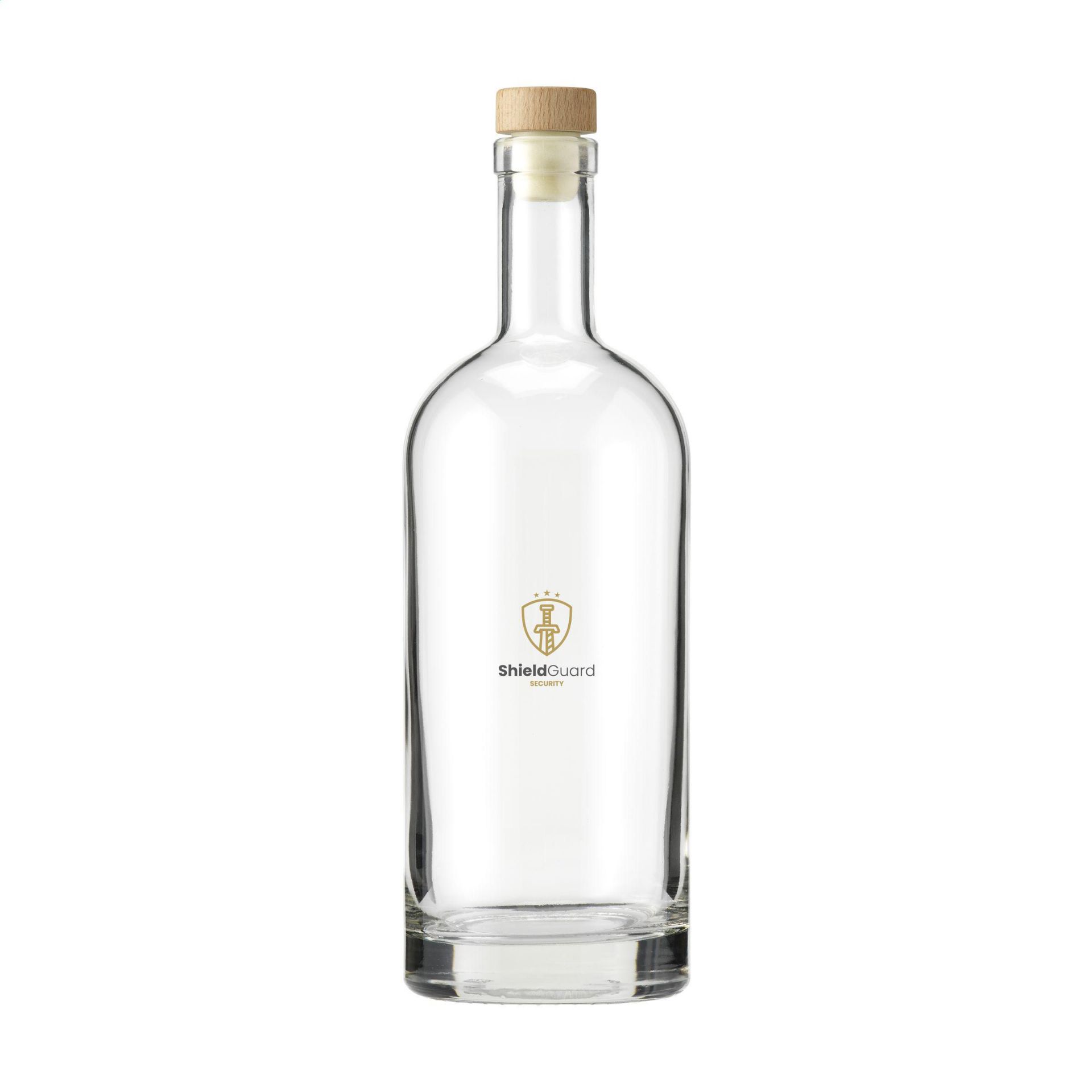 Stijlvolle glazen waterfles met houten dop voorzien van een synthetische kurk en een stevige bodem.