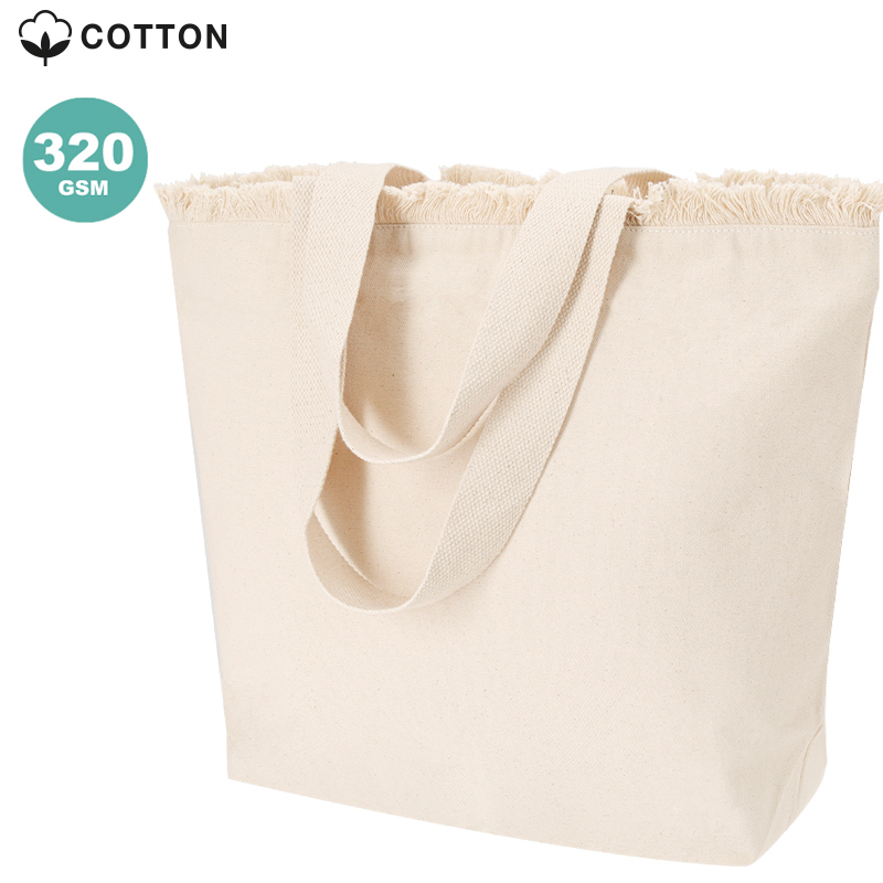 Tas met franjes, gemaakt voornamelijk van 320 g/m2 katoen.