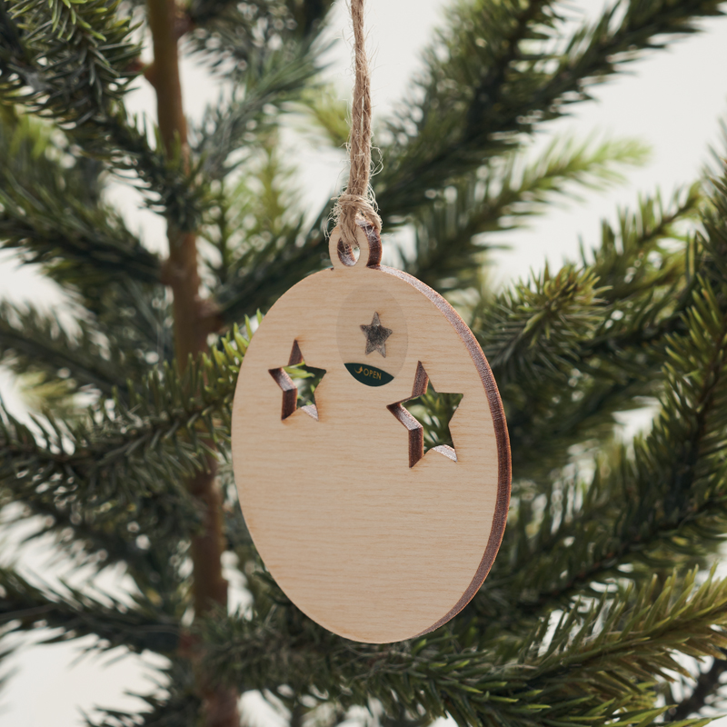 Houten bolvormige decoratiehanger met jute koord inclusief sparrenzaadjes.