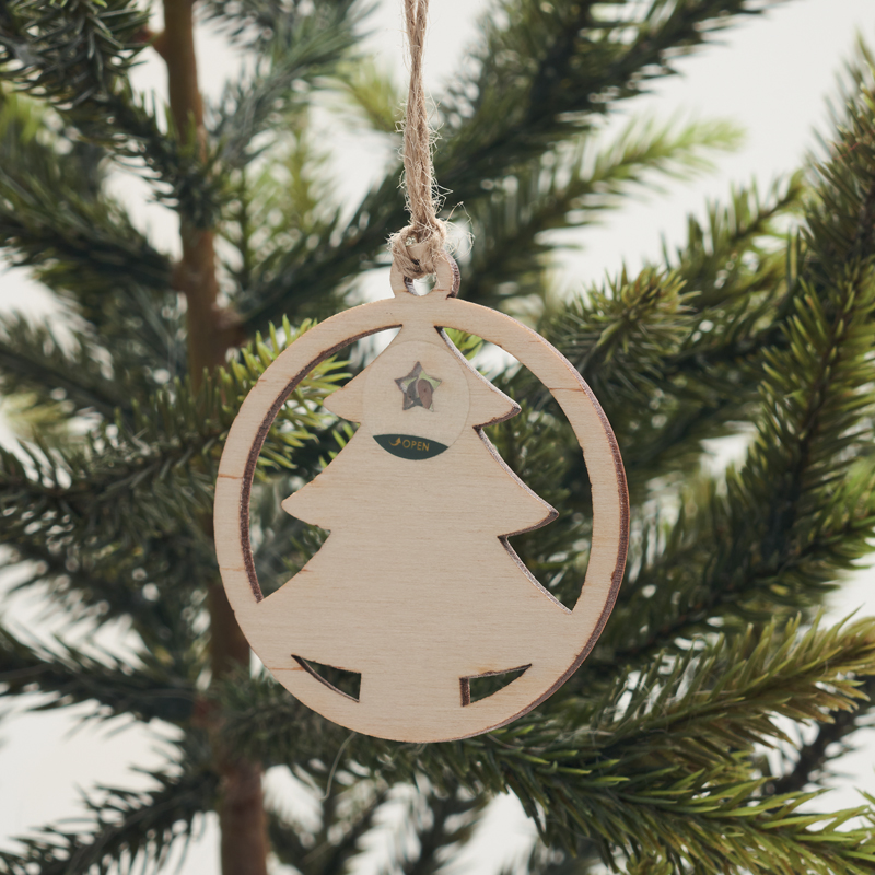 Houten boomvormige decoratiehanger met jute koord inclusief sparrenzaadjes.