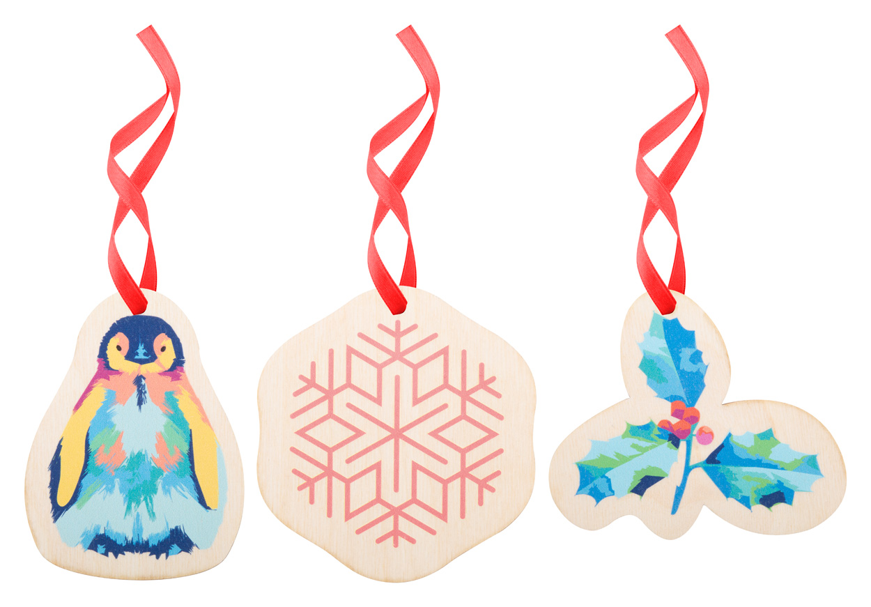 Custom made kerstboomversiering in berkenmultiplex, in custom made vorm en full colour opdruk.