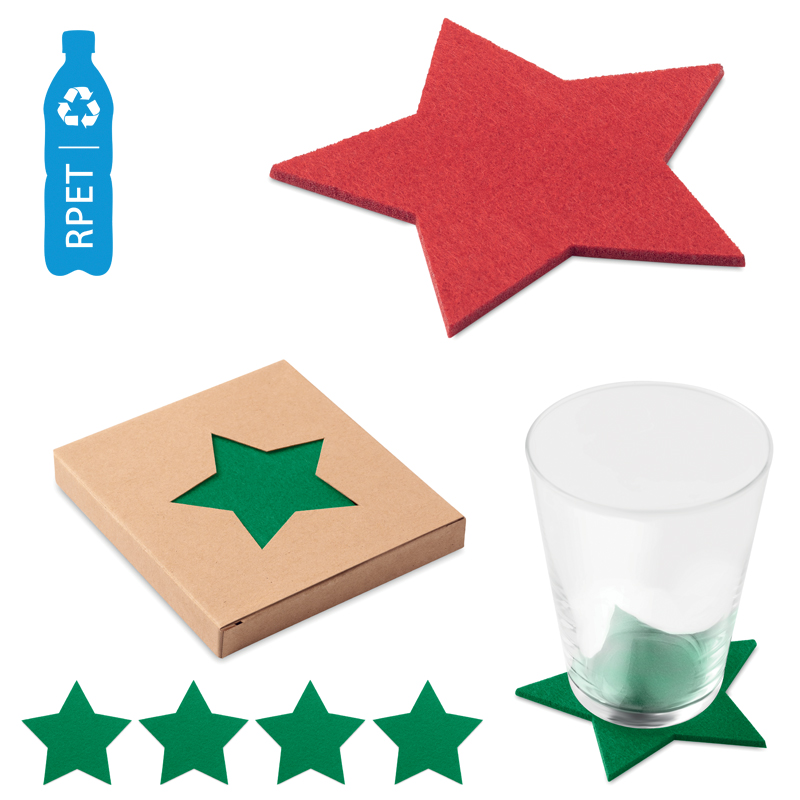 Set van 4 RPET vilten onderzetters in stervorm verpakt in een kraft kartonnen geschenkdoos.