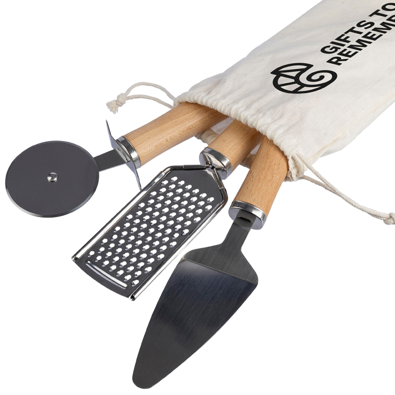 Metalen en houten keukengereedschapset, inclusief een roestvrijstalen rasp, taartschep en pizzasnijder, elk met een houten handgreep.