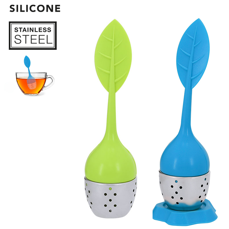 Thee-infuser met bladvorm, gemaakt van siliconen en roestvrij staal.