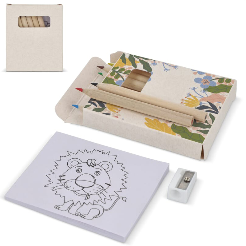 Een complete creativiteitsset voor onderweg, met 6 kleurpotloden, een puntenslijper en een kleurboek, allemaal netjes verpakt in een gerecyclede melkpakdoos.