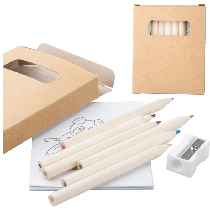 Kleurset, met zes kleurpotloden, puntenslijper en kleurboek.