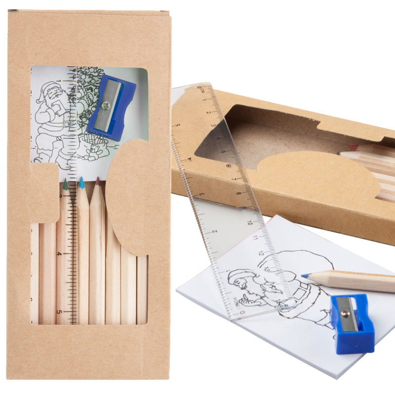 Tekenset met 10 delige potlodenset, 1 puntenslijper, 1 liniaal en kleurboek.