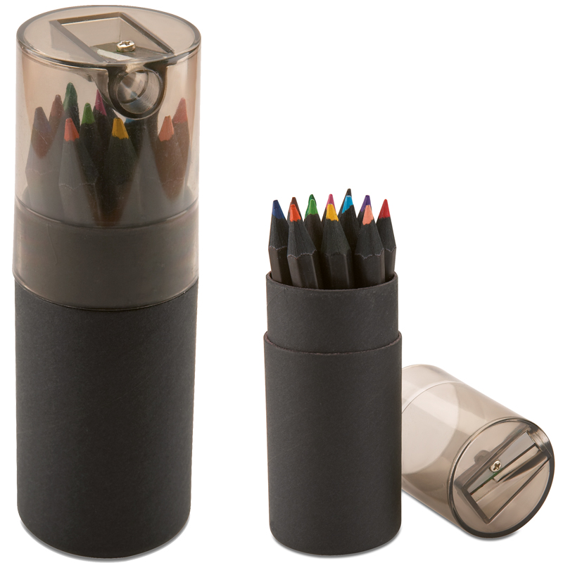 12 kleurpotloden in een ronde doos met een puntenslijper.