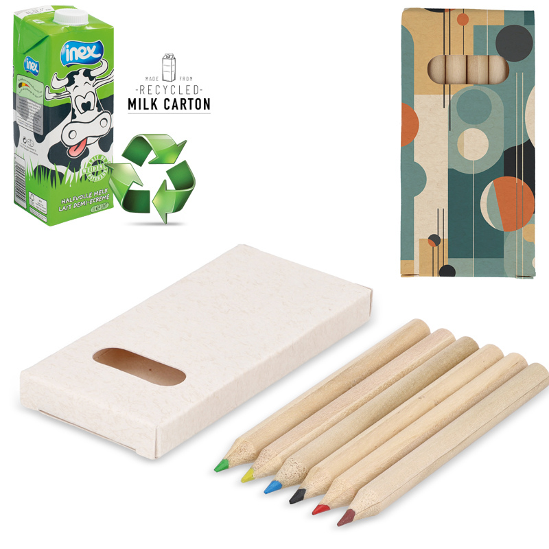 Een set van 6 levendige kleurpotloden, netjes verpakt in een gerecyclede melkpakdoos.