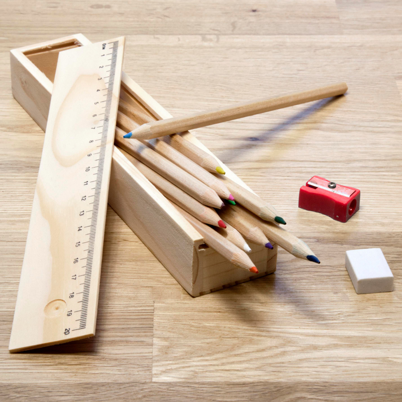 15–Delige tekenset bestaande uit houten kleurpotloden, liniaal, puntenslijper en gum verpakt in een houten doosje.