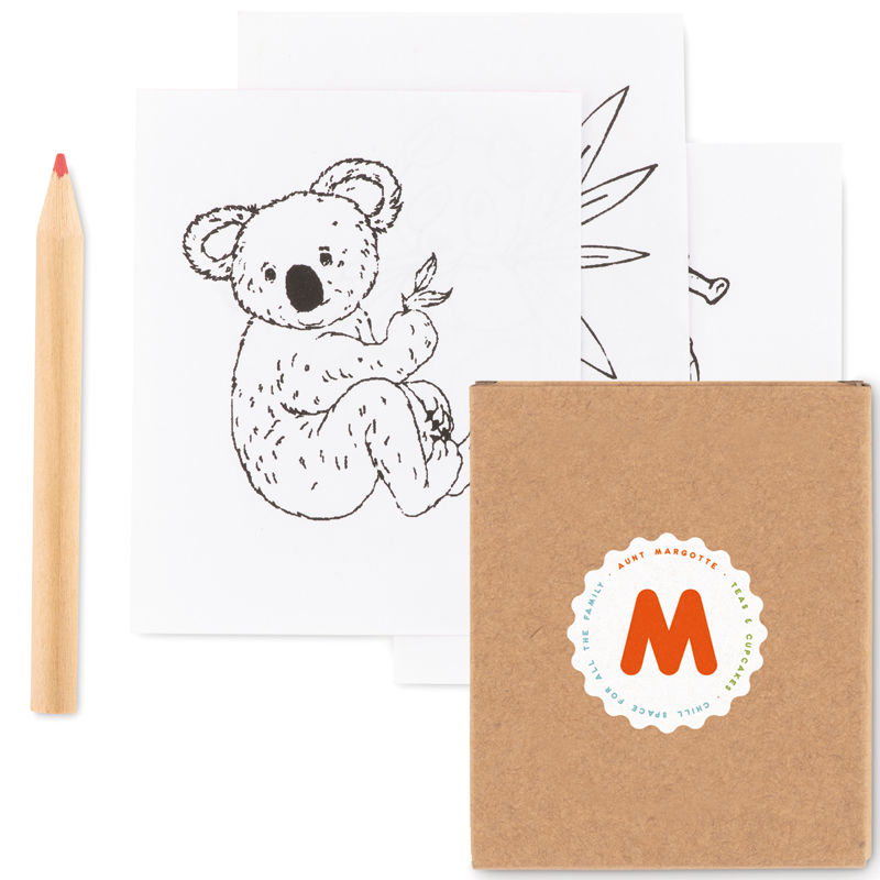Kleurset met 6 kleurpotloden, een houten puntenslijper en 20 kleurblaadjes in een doosje.