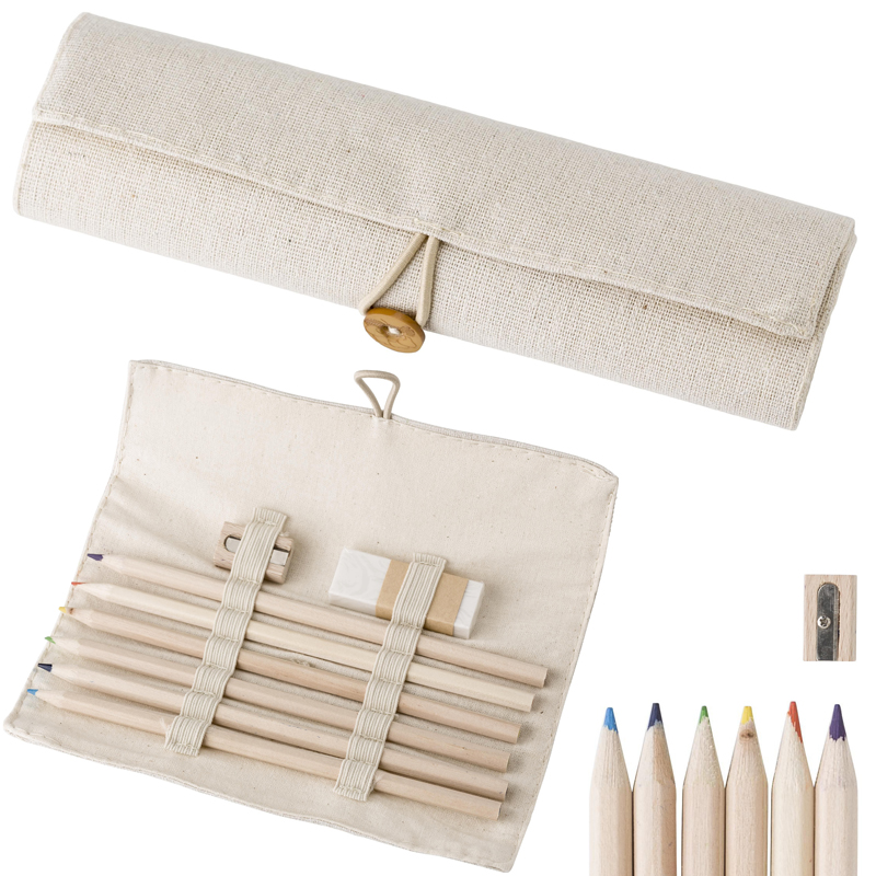 Linnen en katoenen hoes met zes kleurpotloden, een puntenslijper en een gum.