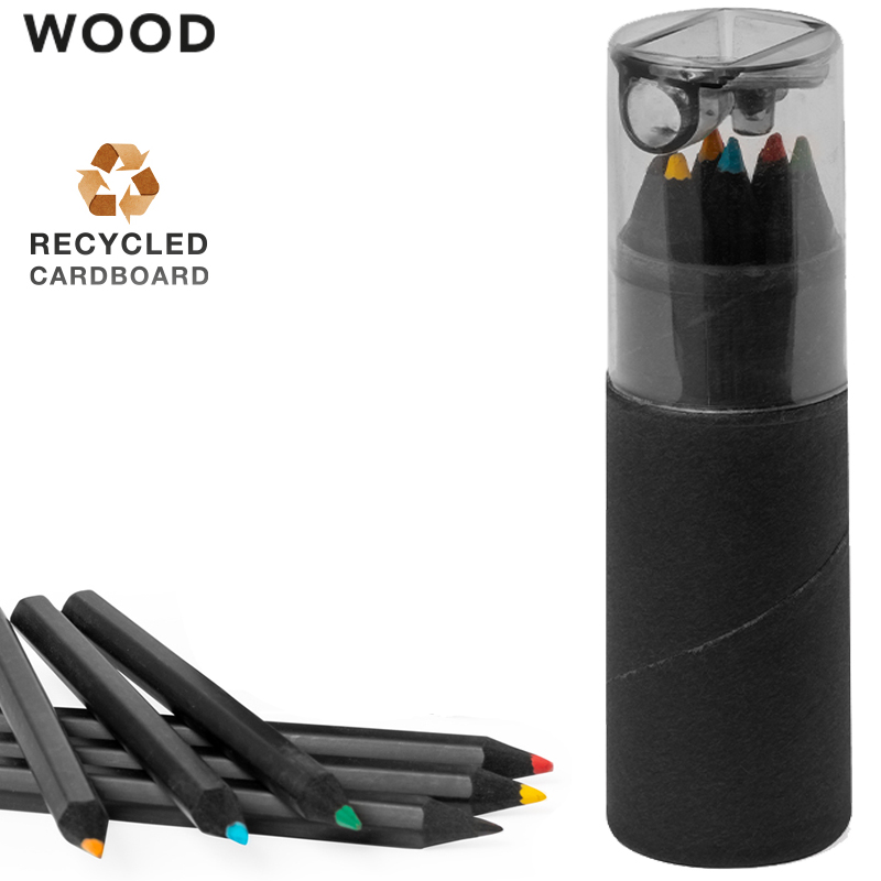 Gepresenteerd in een cilindrische, zwarte gerecyclede kartonnen doos, met bijpassende transparante kap en geïntegreerde puntenslijper.
