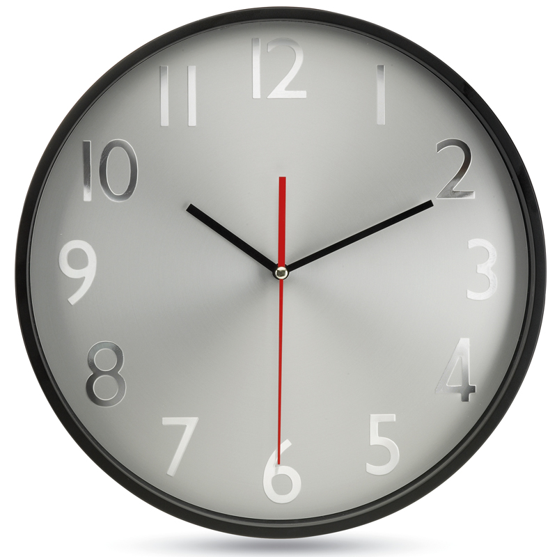Grote wandklok met glasplaat, aluminium wijzerplaat en wijzers.