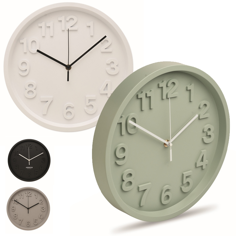 Wandklok in PP met aluminium wijzers en geruisloos uurwerk.