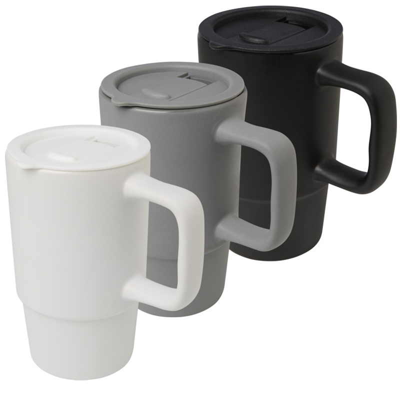 Keramische mok met een grote oversized handgreep om makkelijk mee te nemen en een morsbestendig plastic deksel voor onderweg.