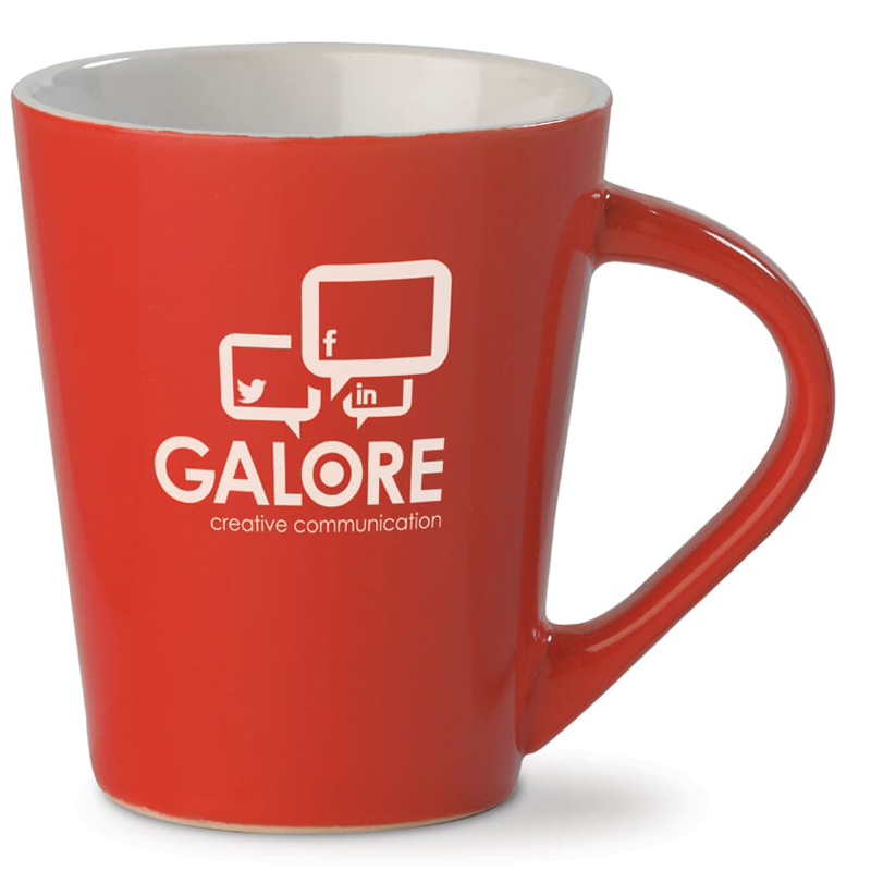 Helderrode aardewerken mok met een conisch design.