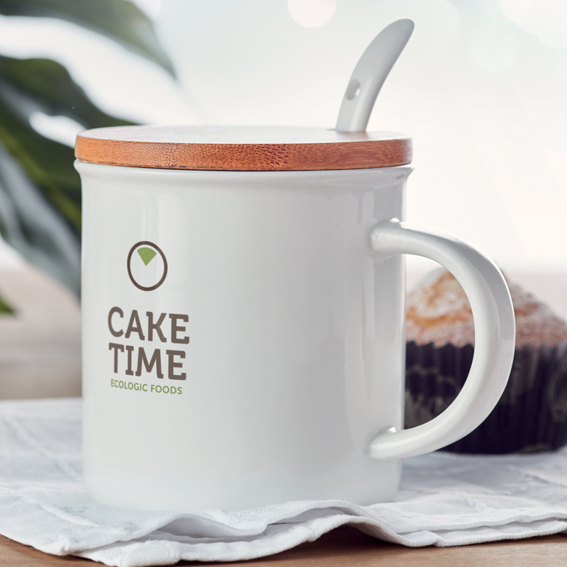 Porseleinen mok met lepel en bamboe deksel met een inhoud van 380 ml.