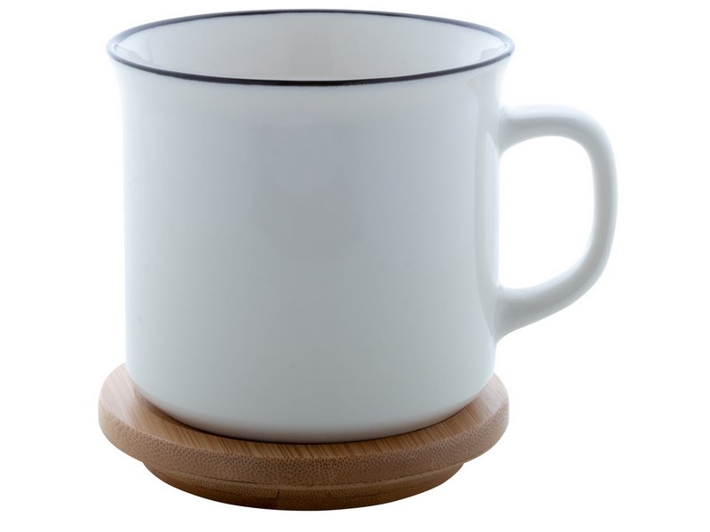 Hoge kwaliteit porselein, vintage mok in witte kleur met zwarte rand en bamboe onderzetter in geschenkverpakking.