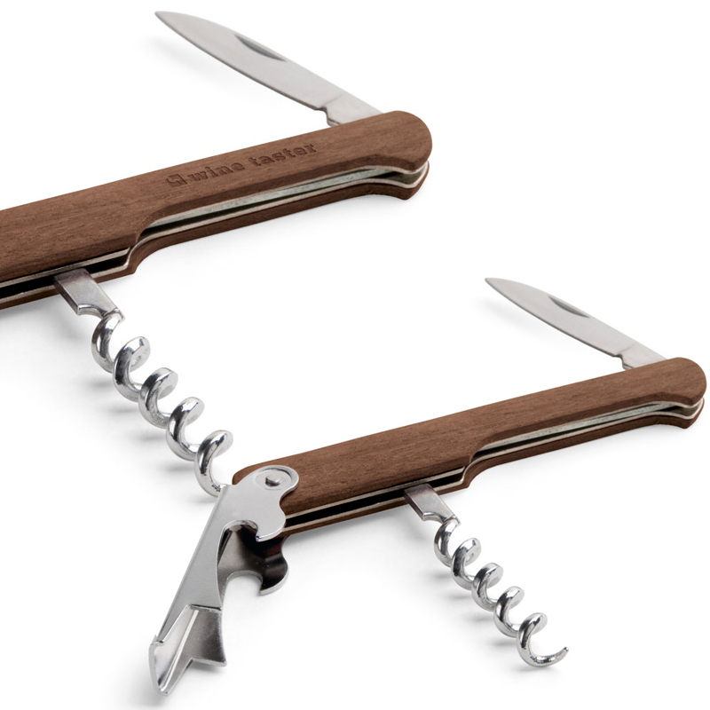 Houten kurkentrekker met flesopener en zak mesje.