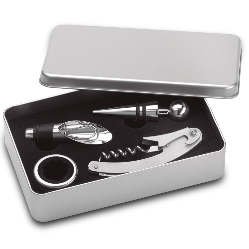 4-delige wijnaccessoires-set bestaande uit een flessenopener, stop, schenktuit en wijnring.