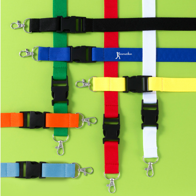 Polyester lanyard met veiligheidssluiting, kunststof gesp en karabijnhaak.