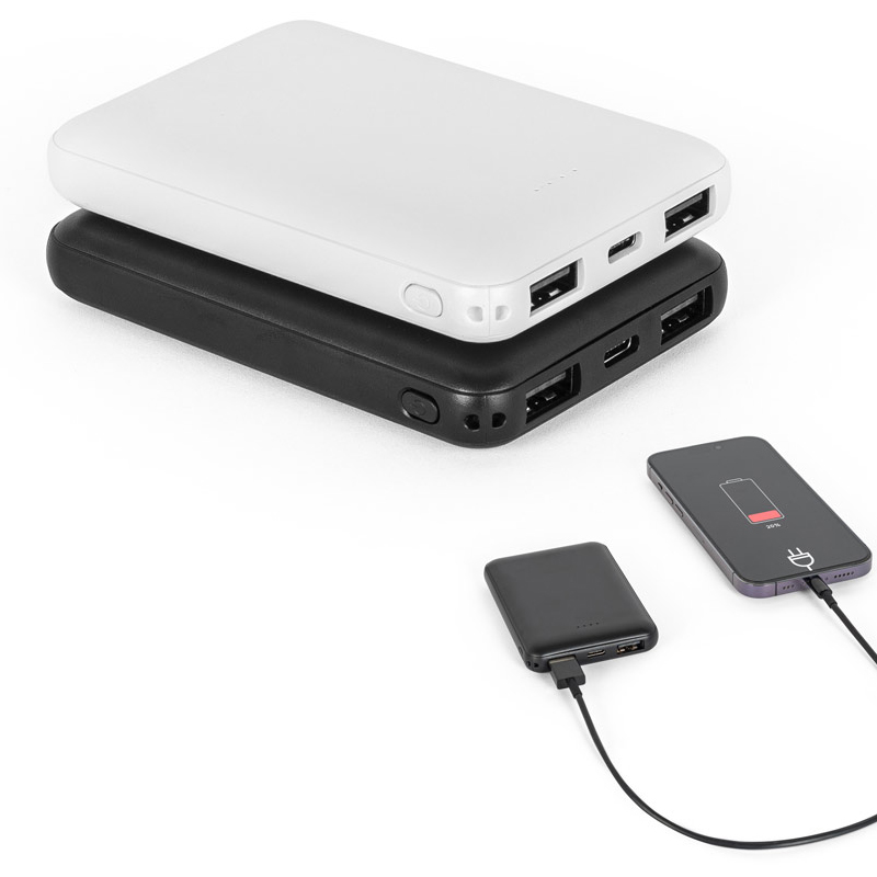 Materiaal: Gerecycled ABS (100% rABS). Capaciteit: 5000 mAh. Ingang: microUSB, USB-C (10W). Uitgang: USB-C, 2 x USB-A (12W). Kenmerken: geschikt voor het tegelijkertijd opladen van 3 apparaten. Inclusief: USB-A/USB-C-kabel.