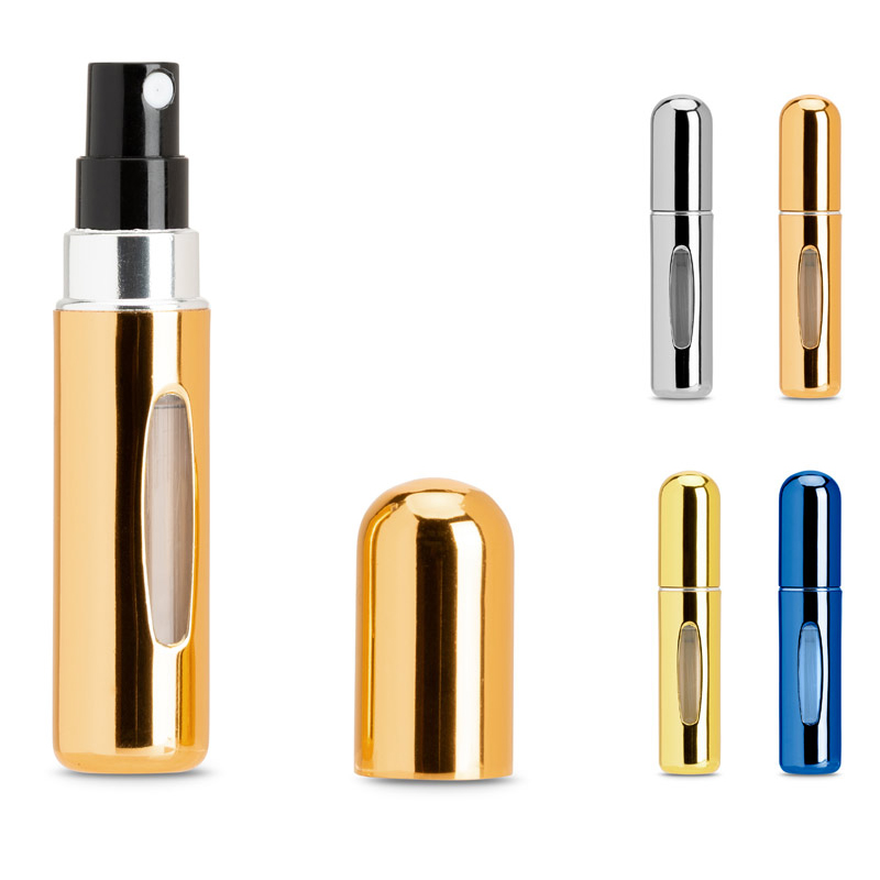 Navulbare aluminium parfumverstuiver, ontworpen voor eenvoudig bijvullen: verwijder simpelweg de dop en verstuiver van het parfumflesje, steek de steel in het ventiel aan de onderkant en pomp om te vullen.
