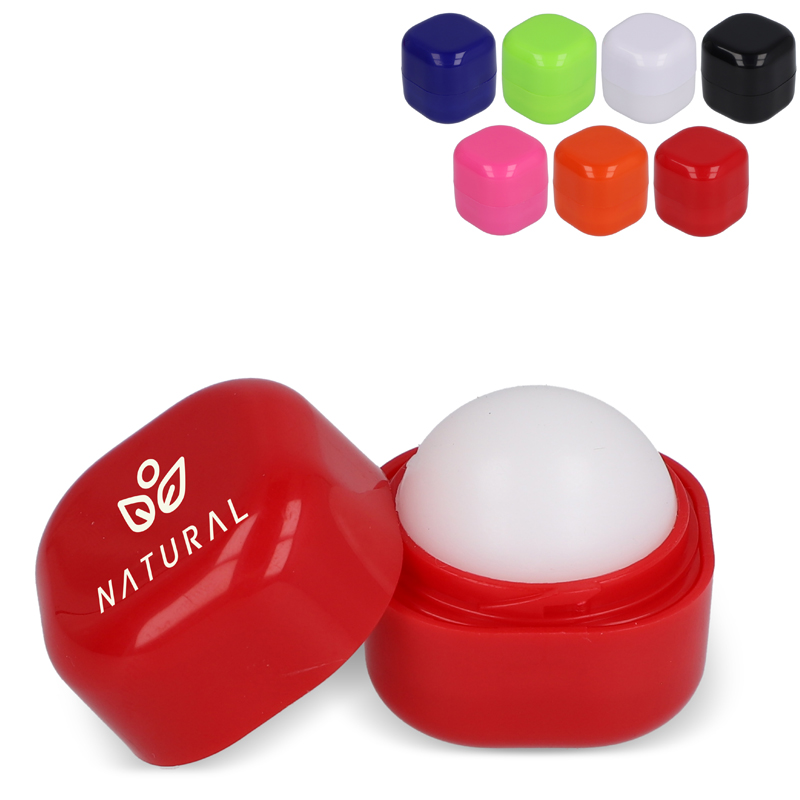 Lippenbalsem in een kubusvormig potje gemaakt van gerecycled ABS.