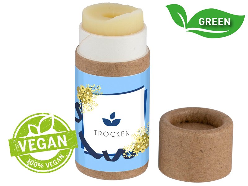 4,6 g vegan lippenbalsem in composteerbaar kartonnen hulsje. bevat shea butter, olijfolie en jojoba olie. dermatologisch getest, geproduceerd in duitsland.