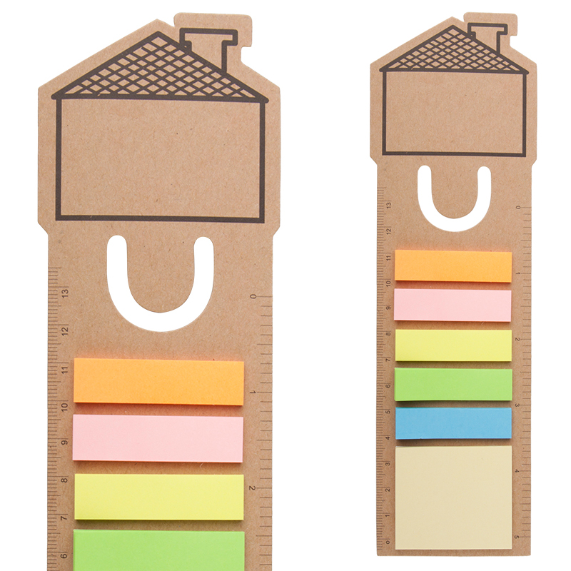 Papieren boekenlegger met liniaal en zelfklevende notitieblaadjes.