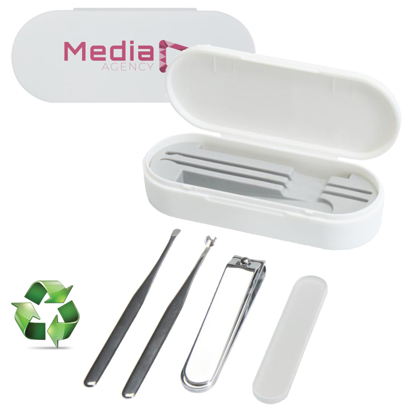 Hij heeft een gladde glazen nagelvijl, een duurzame nagelknipper, een precisienagelriemstokje en een oorlepeltje voor veelzijdige verzorging.