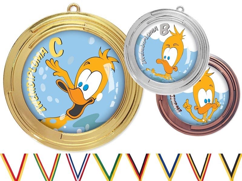 Met enkelzijdig dominglabel. drukformaat: ø 50 mm met halslint. verkrijgbaar in goud, zilver of brons medaille ø 70 mm kan ook bedrukt worden.