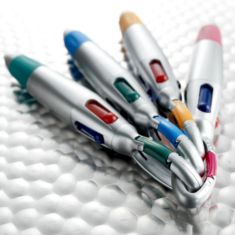 4–in–1 Zilverkleurige kunststof balpen, rood–/blauw–/groen–/zwartschrijvend, met gekleurde rubberen grip en karabijnhaak.